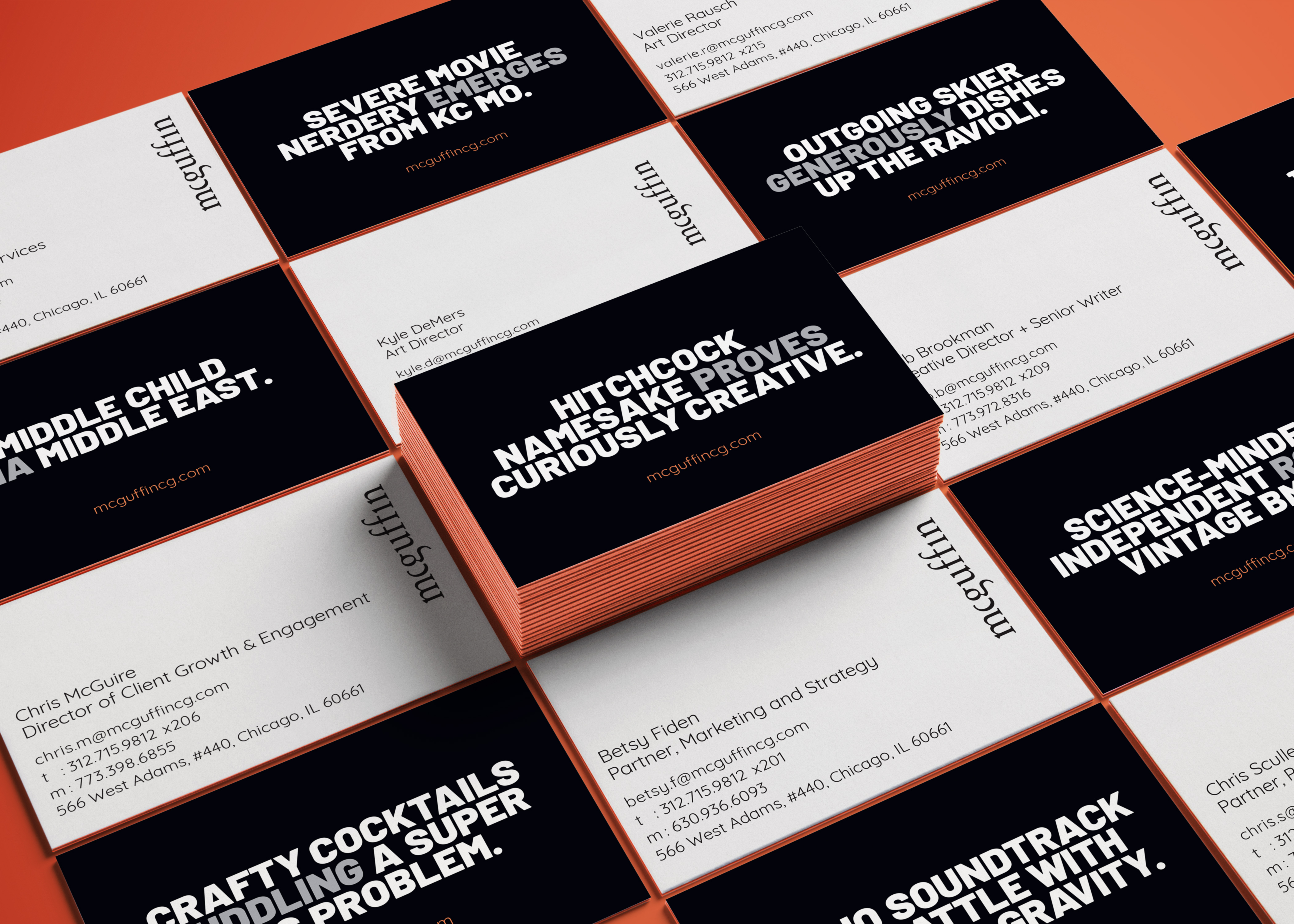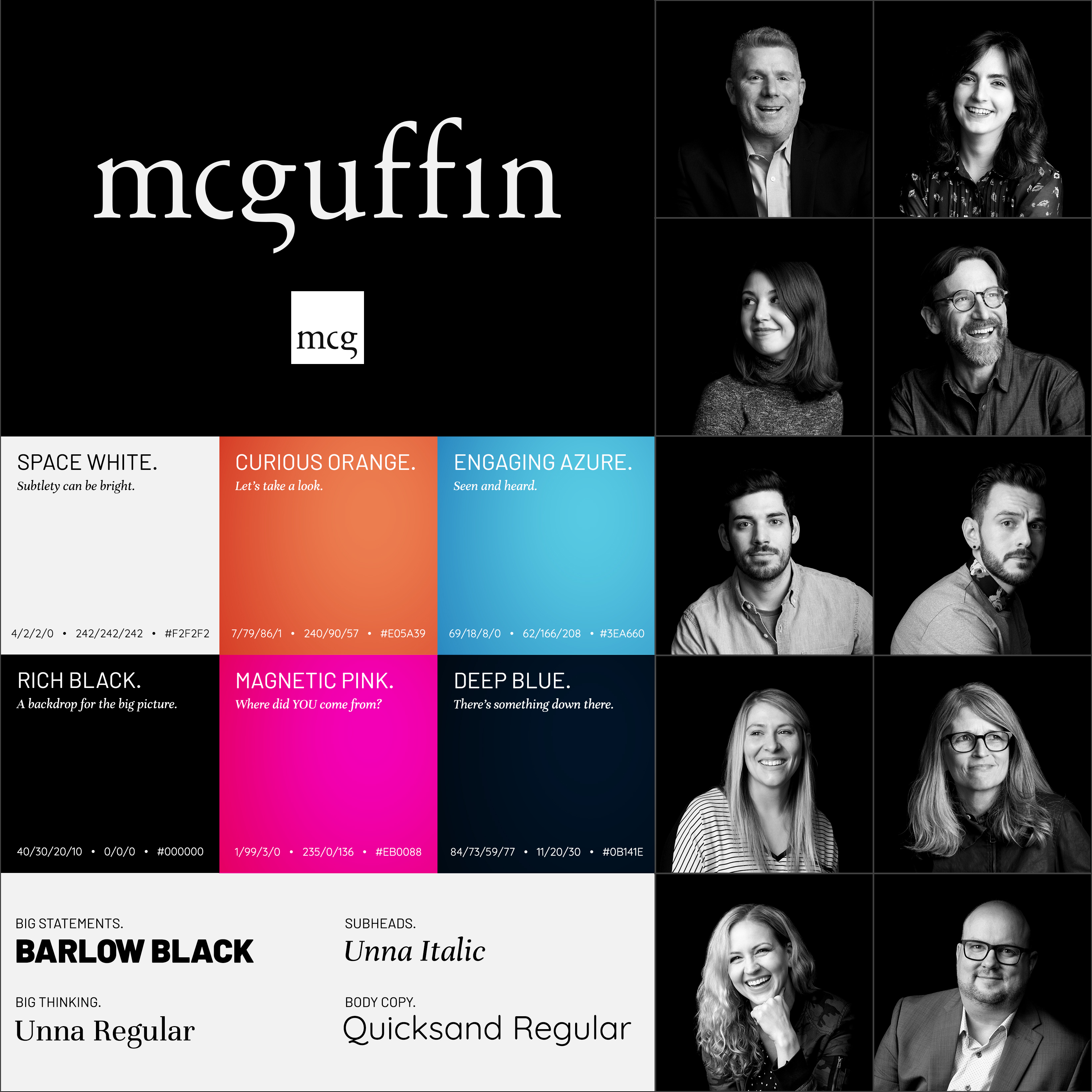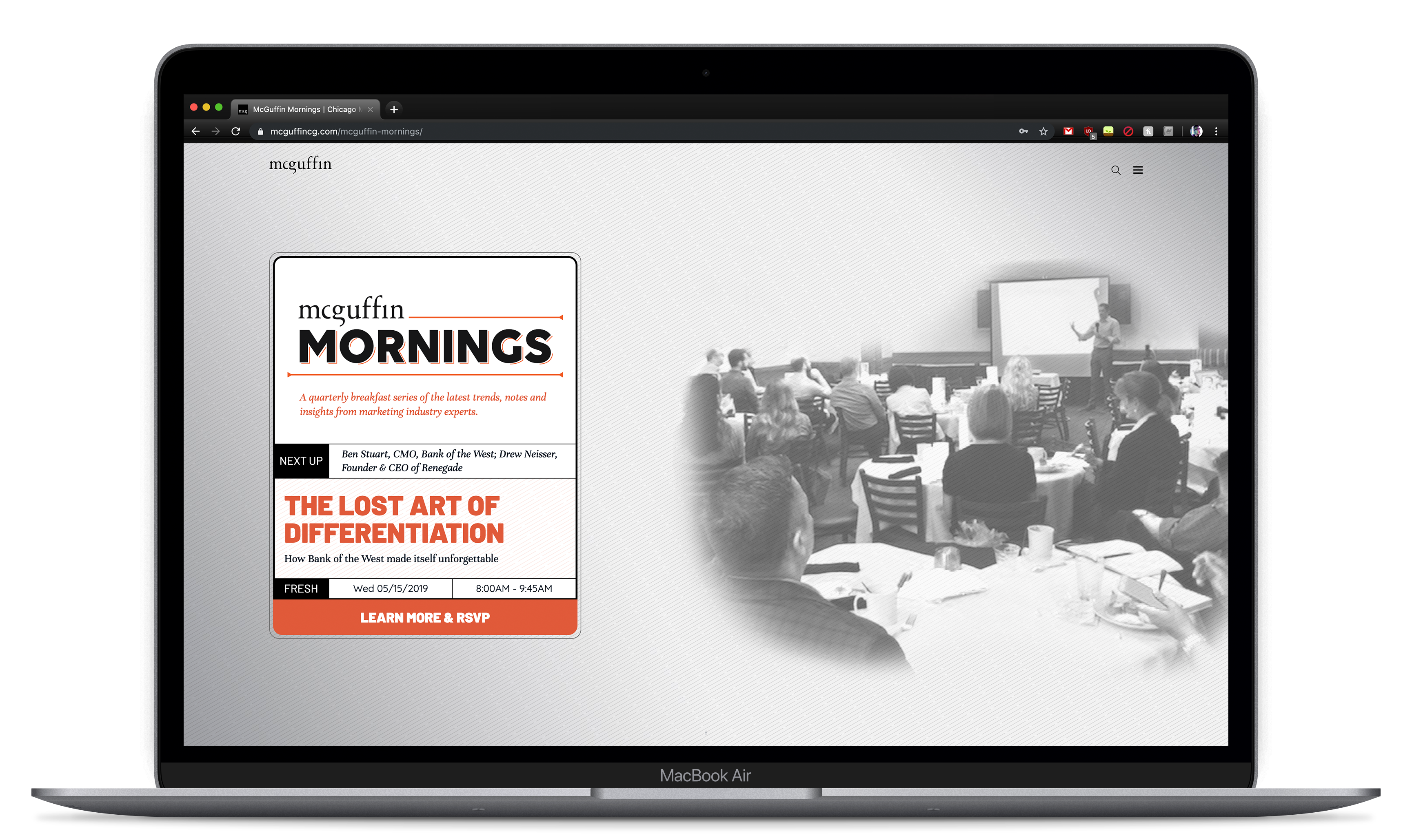 In rebranding the agency, sub-brands received a look that was connected to the greater McGuffin umbrella but were able to stand on their own. This included developing new logos for both the McGuffin Grant (a grant of $25,000 worth of creative services given to a non-profit on an annual basis) and McGuffin Mornings (a quarterly thought leadership series of speakers across different marketing media over a breakfast).