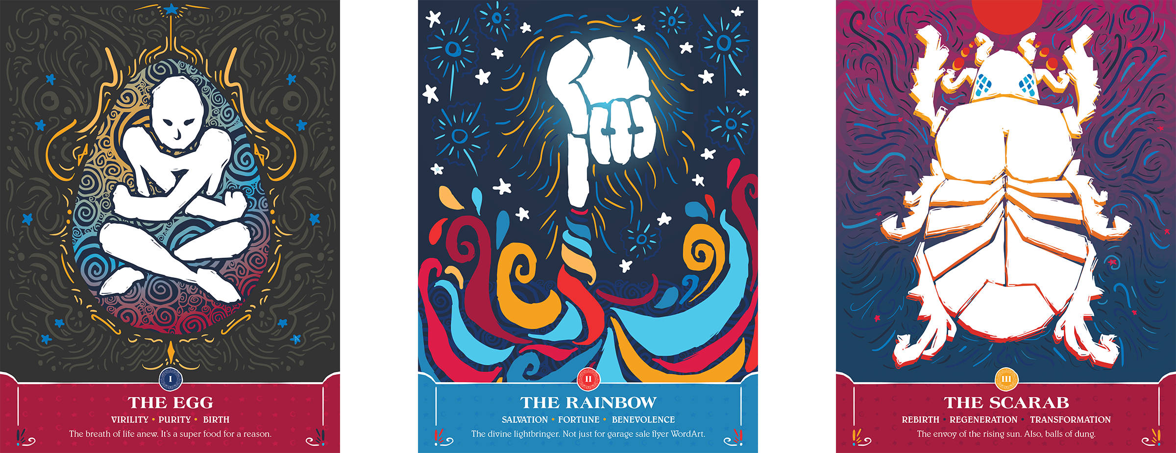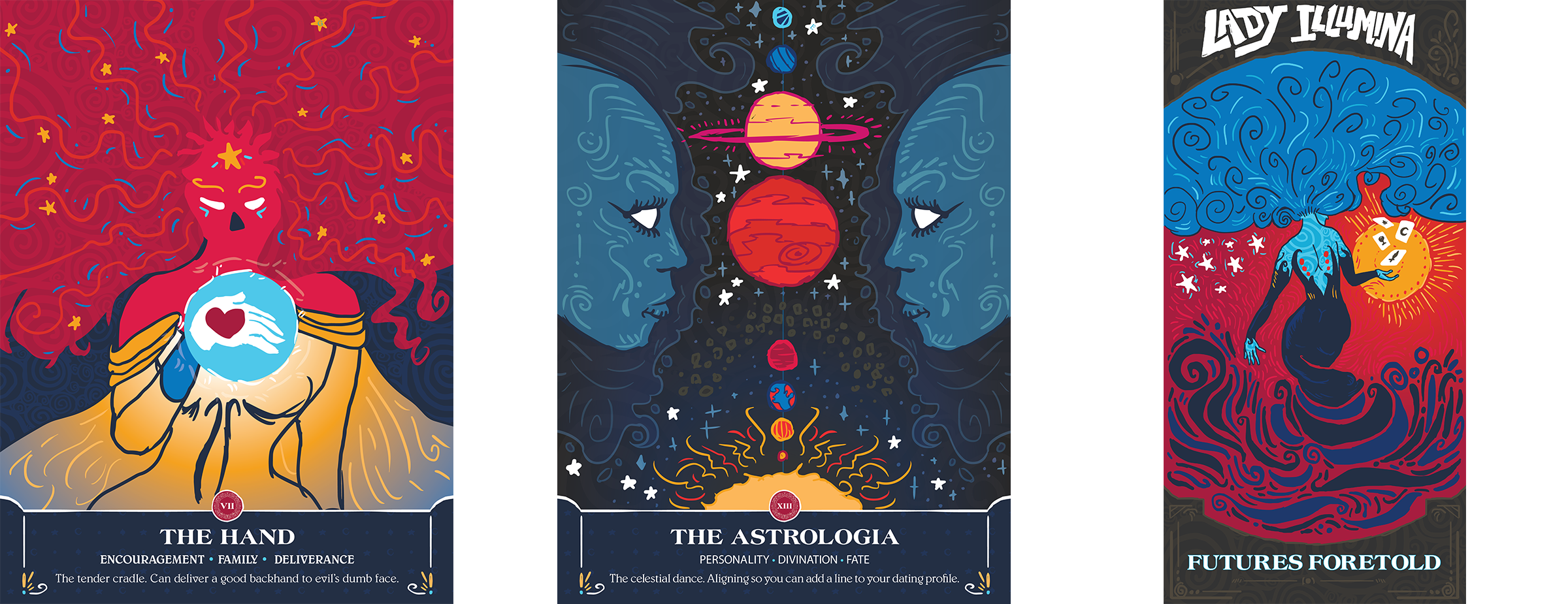 Lucky symbology covers so many different cultures and backgrounds, it's hard to settle on one. Overall the theme was picked to be a colorful, explosive union of all things magical, which added to a hand-made look inspired from tarot cards and deep south voodoo.