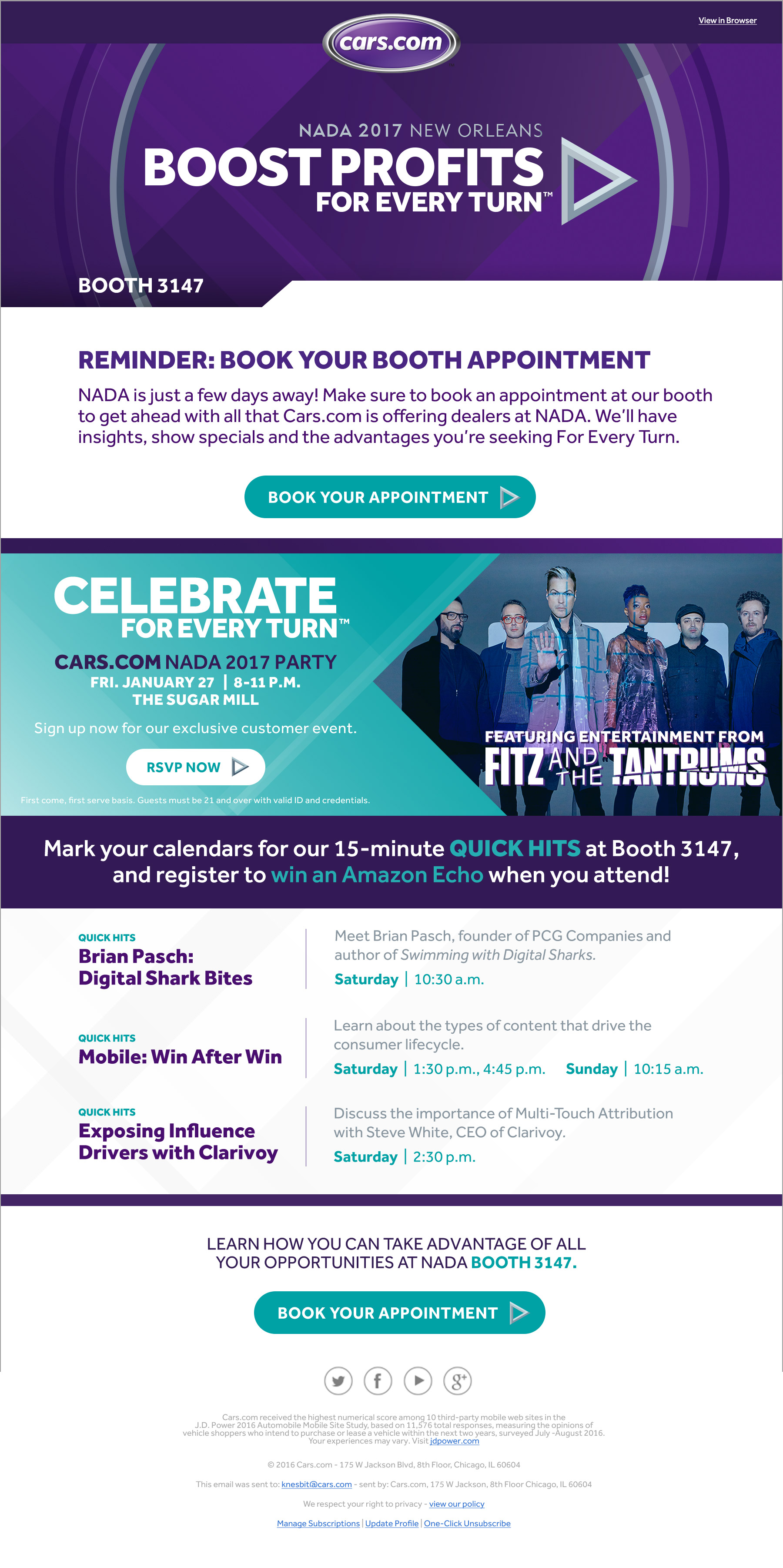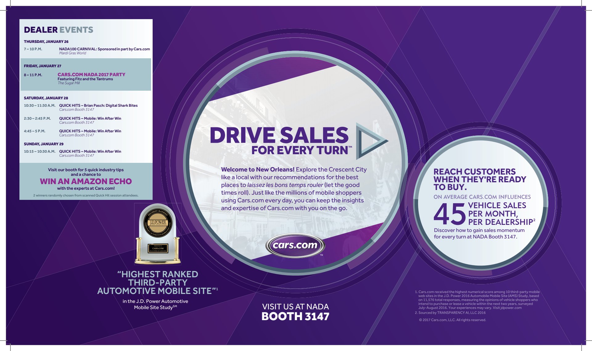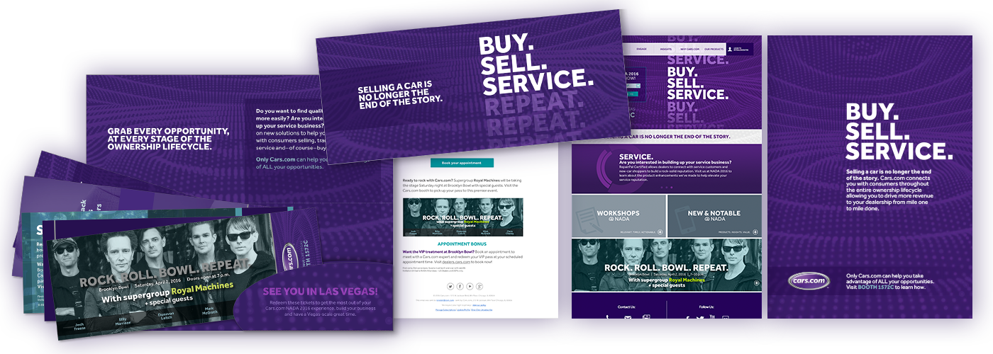 The National Automobile Dealers Association Show Expo is the hottest dealer event of the year for the auto industry. Cars.com asked for the biggest footprint in the massive 700,000 square foot spaces in Las Vegas and New Orleans. The two-story booth was able to repurposed and rebranded for a second year, but both years featured unique theming that involved print and digital campaigns, landing pages, giant video walls, keynote speakers, and a few celebrity appearances.