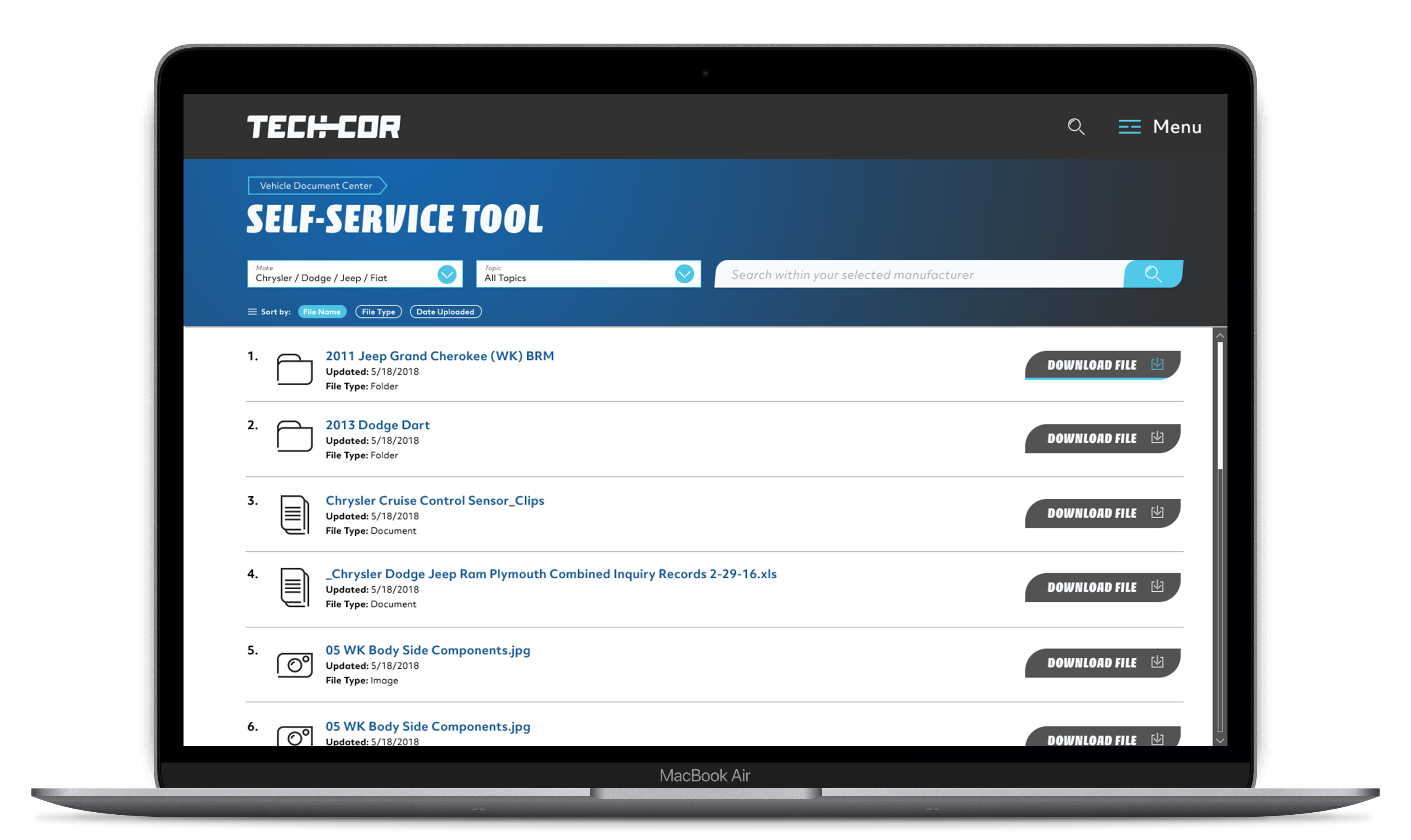 Since agents often used the Tech-Cor research database on the road (usually at an auto repair shop when assessing damages), the first function added right to the homepage was a massive search bar. With a library of this size, a search database was the easiest approach to finding the right information.